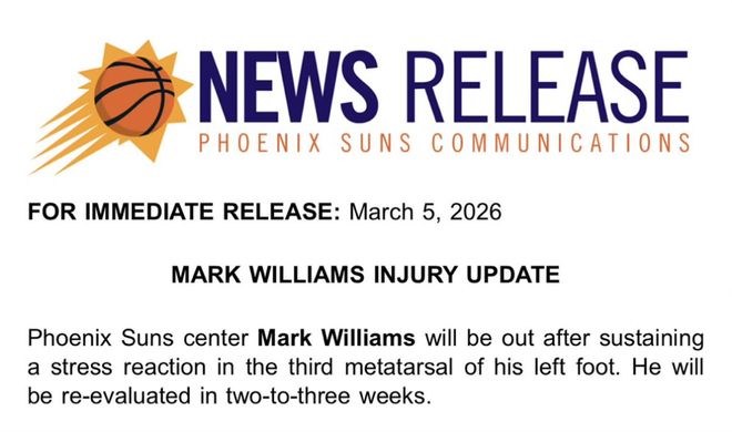 来自太阳官方的最新消息,球队中锋马克威廉姆斯因左脚第三跖骨出现应力性反应(骨骼过度使用损伤的早期阶段)将暂时缺席,他将在2-3周之后重新评估。